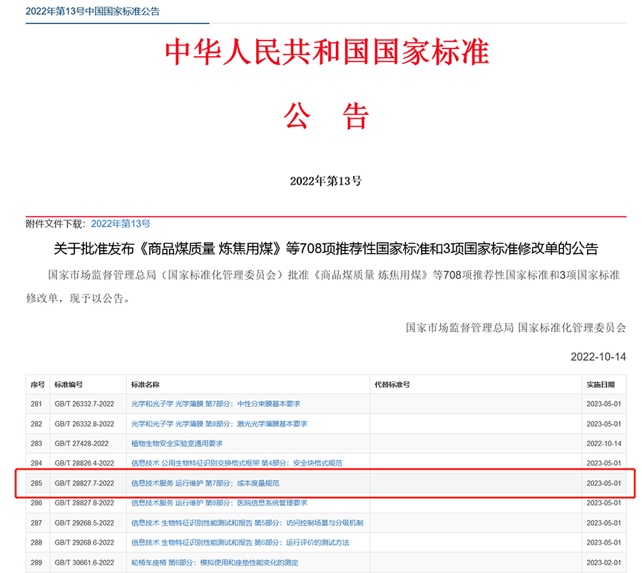 國家市場監(jiān)督管理總局 國家標準化管理委員會于2022年10月14日發(fā)布2022年第13號中國國家標準公告,批準《信息技術服務 運行維護 第7部分:成本度量規(guī)范》國家標準正式發(fā)布,標準號為GB/T 28827.7-2022,2023年5月1日開始實施。