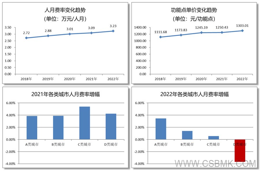 總體上各地人月費率保持了平穩(wěn)增長,但增幅較前一年明顯放緩,同時呈現(xiàn)A類城市增幅最高,B類次之,C/D類城市增幅最小。這一方面是由于采樣范圍擴大,增加了較多經(jīng)濟欠發(fā)達的C/D類省會城市;另一方面,也不排除因為持續(xù)的疫情對人月費率增長帶來負面影響。