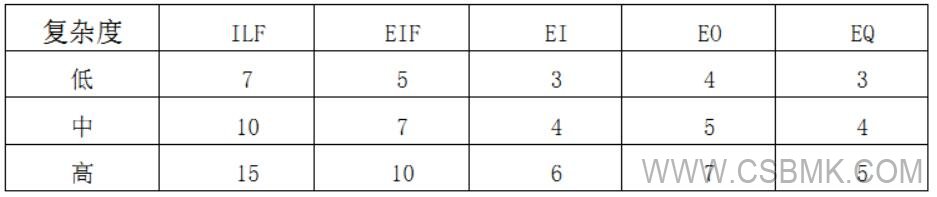 NESMA方法在各功能類型的復雜度確定后,可用表1所示的矩陣來確定各組件的功能點值。