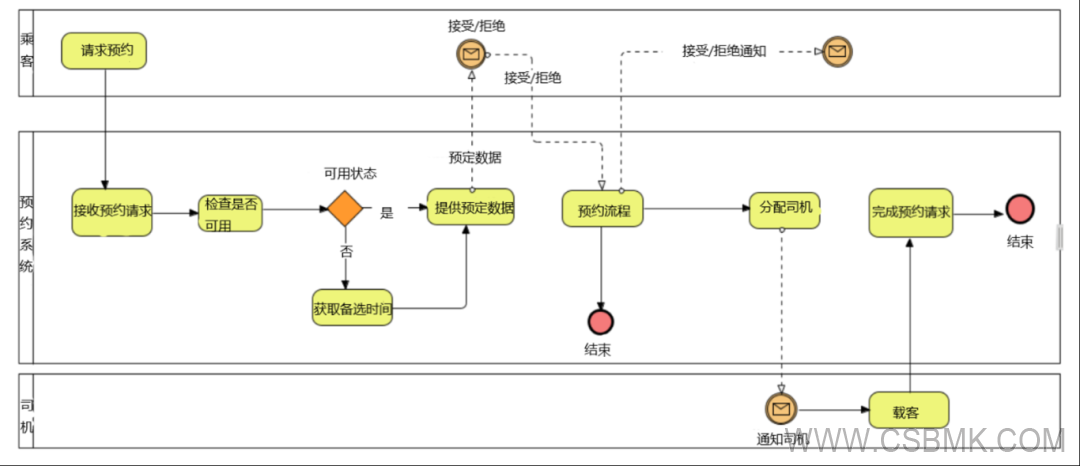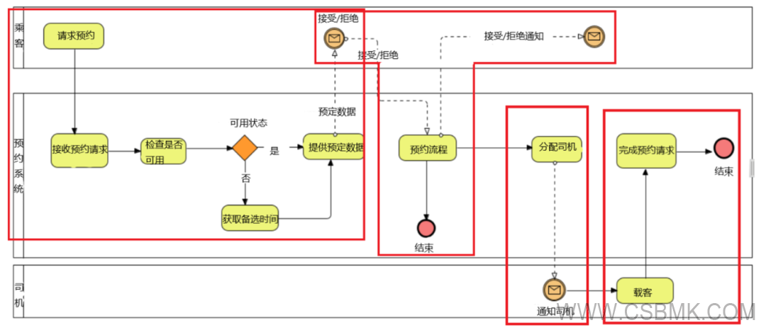 以下示例說明了前文描述的所有概念。下圖為“預(yù)約系統(tǒng)”的業(yè)務(wù)過程,其業(yè)務(wù)目標(biāo)是“乘客預(yù)約乘車”。