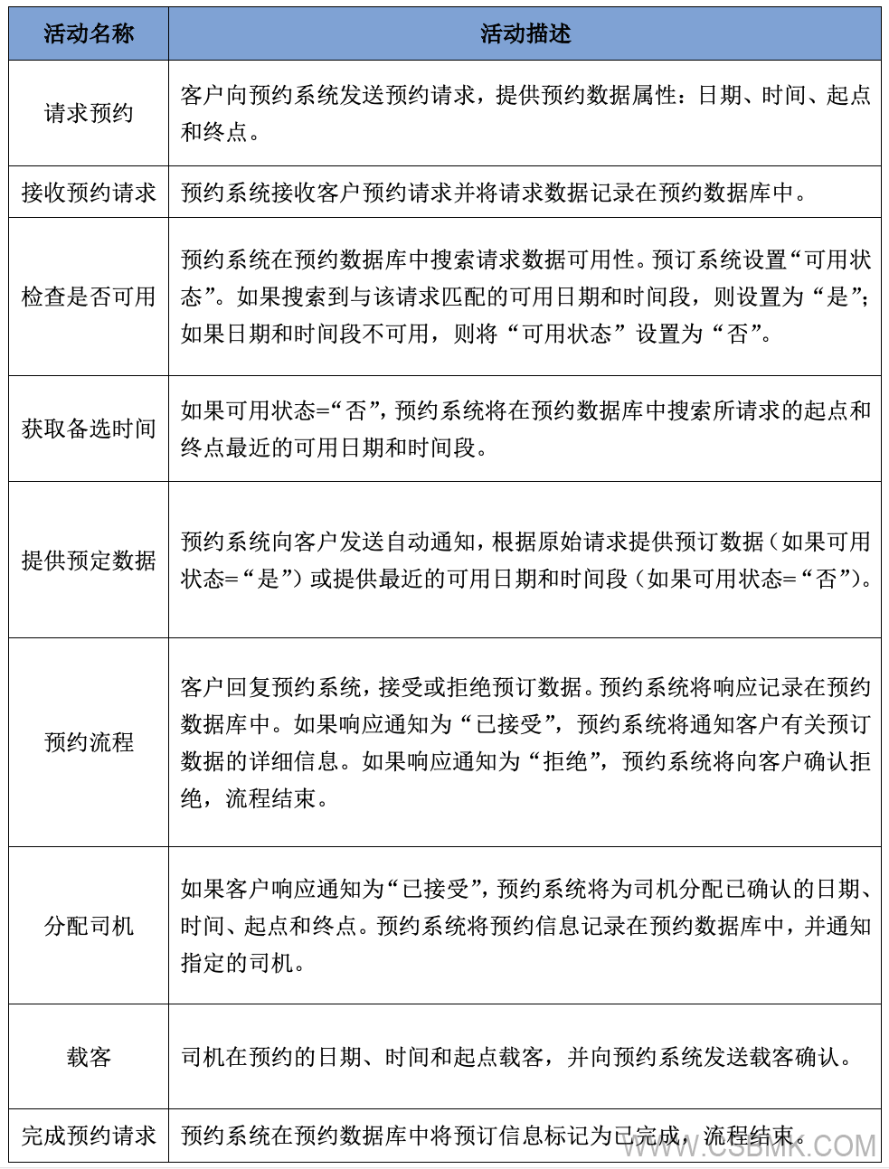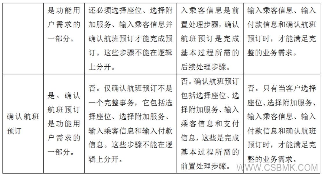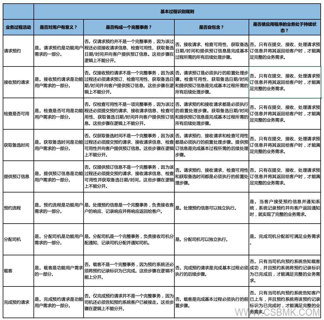 注:如果用戶或系統(tǒng)中止/取消流程,則流程將中斷,且系統(tǒng)沒有其他響應(yīng)。“乘客”和“司機(jī)”是預(yù)約系統(tǒng)的用戶。因此,預(yù)約系統(tǒng)業(yè)務(wù)價值由預(yù)約過程的用戶視圖表示,這是識別基本過程的規(guī)則之一。