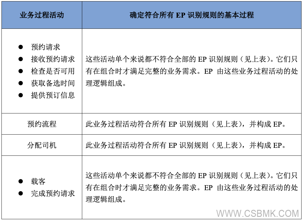 表8針對每個活動進(jìn)行了分析,通過應(yīng)用第2節(jié)“基本過程、用戶和業(yè)務(wù)過程”中所述的EP識別規(guī)則來識別基本過程。