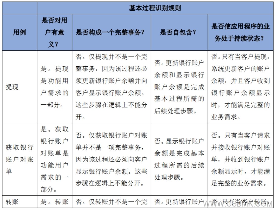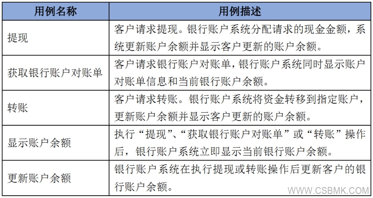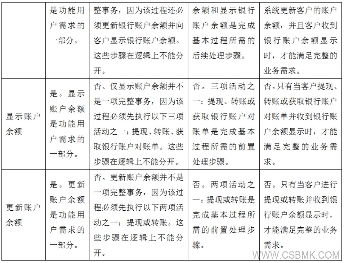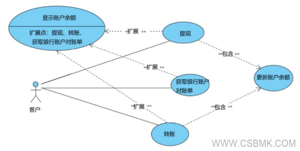 同樣,用例“提現(xiàn)”和“轉(zhuǎn)賬”中包含用例“更新銀行賬戶余額”,使更新銀行賬戶余額活動成為完成業(yè)務(wù)價值(提現(xiàn)和轉(zhuǎn)賬)的強(qiáng)制性步驟。