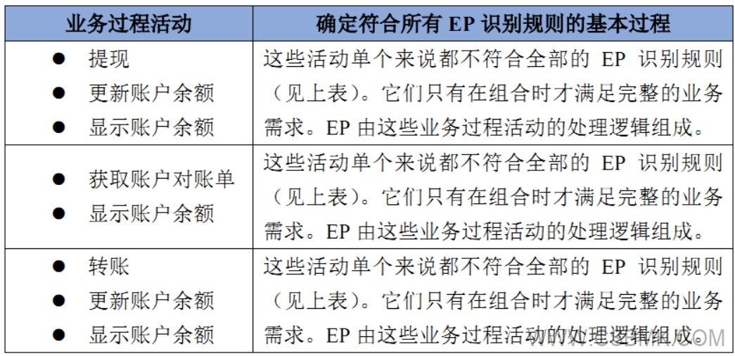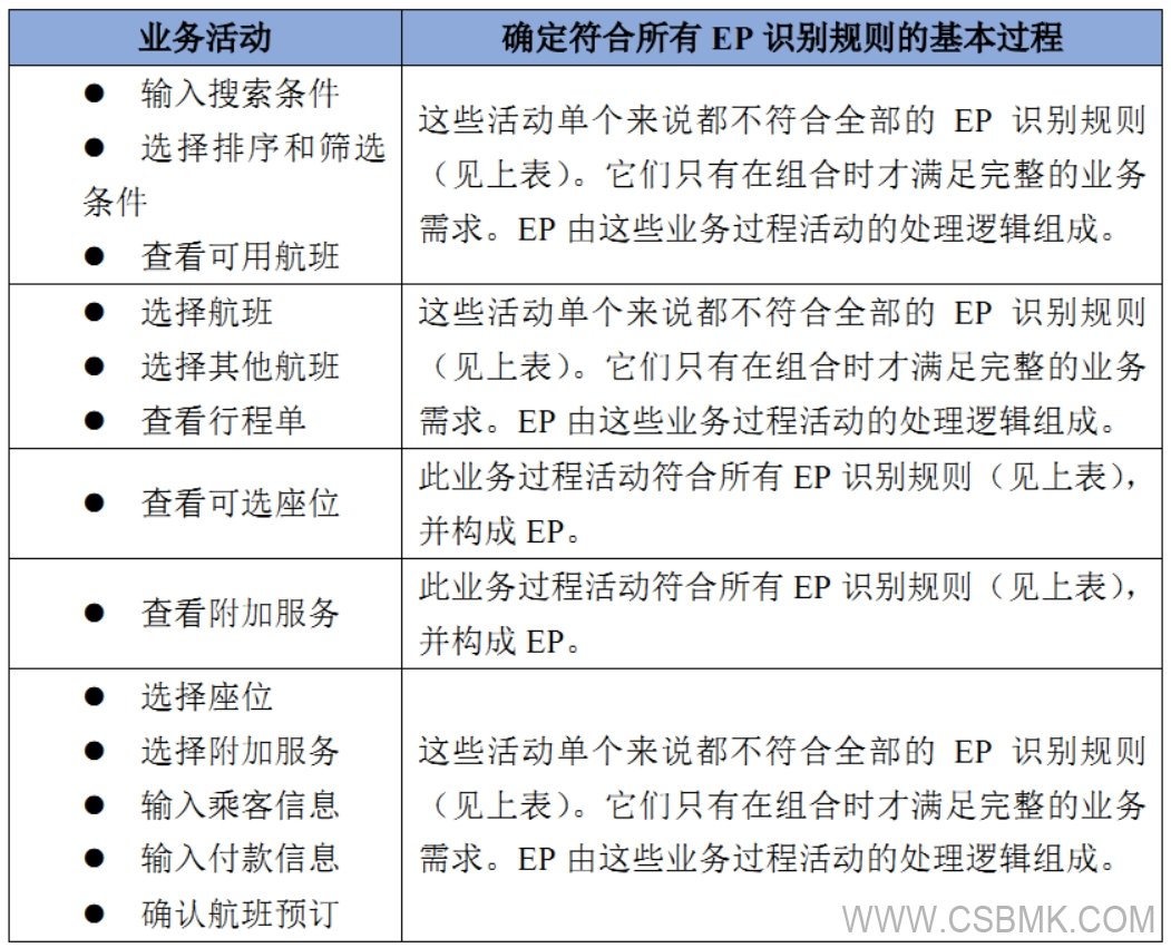 識別EP的所有關(guān)鍵概念都可以通過業(yè)務(wù)過程相關(guān)聯(lián):EP由為業(yè)務(wù)過程提供所需步驟的活動或一組相關(guān)活動組成,其結(jié)果是最小的、有意義的、完整的和業(yè)務(wù)可識別的。