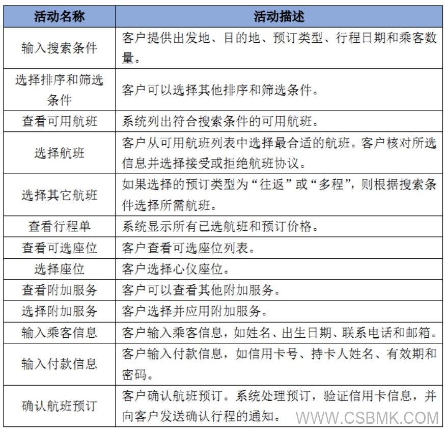 “客戶預(yù)訂航班”業(yè)務(wù)過程可根據(jù)上述截圖進(jìn)行分析,分解為下列活動,如表7所示。