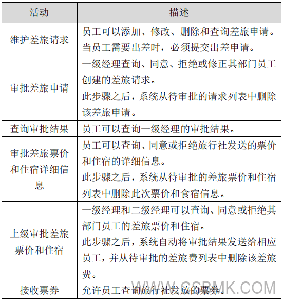 旅行社是公司外部的服務(wù)提供商,不與差旅系統(tǒng)交互。旅行社為該公司編制預(yù)算并預(yù)定所需的票券和住宿。