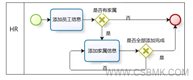 例如,在人力資源(HR)系統(tǒng)中,用戶希望添加一名員工及其家屬8。圖 6和圖 7 分別展示了兩種級(jí)別的 BPMN 模型示例。