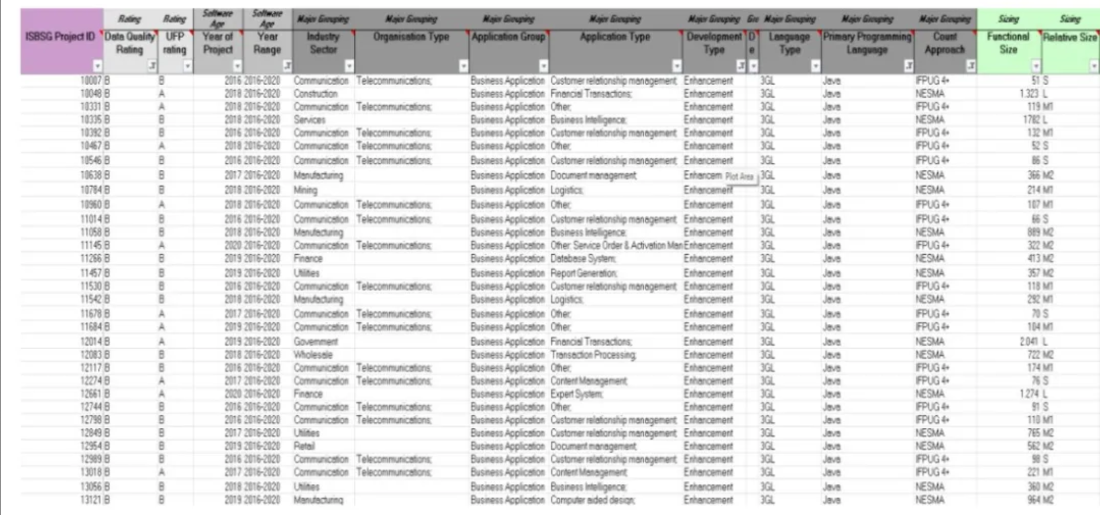 ISBSG 收集行業(yè)數據,使用 ISO/IEC 標準化的、客觀的、可重復的、可審計 的方法(如 Nesma、IFPUG 和 COSMIC 功能點)來衡量產出。ISBSG“新開發(fā)和增 強”存儲庫中包含數千個已完成的項目、發(fā)布版本和 sprint,可以通過這些行業(yè) 數據進行判斷和決策。決策為了了解團隊 A 的 PDR 績效,可以將其與行業(yè)平均水平進行比較。圖 2 展 示了如何篩選 ISBSG 數據集,該數據集為 MS Excel 文件。以下為篩選條件: