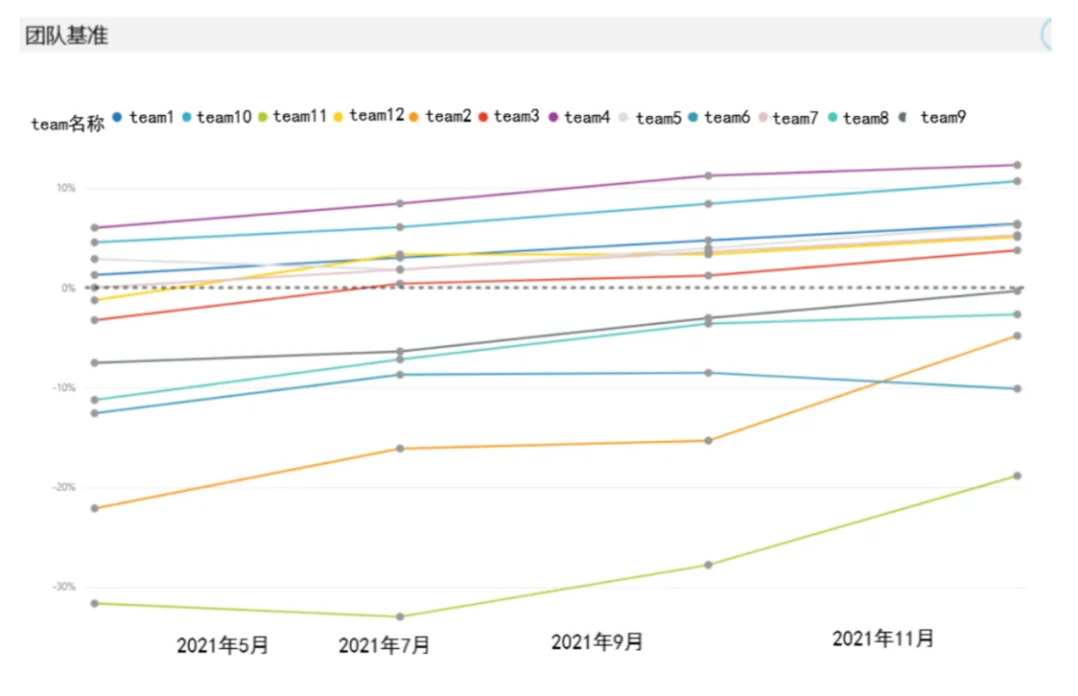 由于這些分布向右傾斜,所以使用中值而不使用平均值來表示市場平均水平。因此,對于此數據集,中值為 8.1 小時/EFP,通常稱之為“市場平均值”?,F在可以評估 Java 團隊(團隊 A)的績效,即 12.9 小時/EFP,在分布中處 于 P80 和 P90 之間。在分析 PDR 值時,較低的值表示創(chuàng)建一個功能點所花費的時間較少。因此,與行業(yè)市場平均水平相比,A 隊的績效不是很好。生產率指數是一個可用于將團隊 PDR 與行業(yè)平均值進行比較的指標。該指 標計算方式為:1-(團隊PDR/市場平均PDR)。因此,團隊 A 的生產率指數為1–(12.9/8.1)=-60%。因此,該團隊的表現比市場平均水平差 60%。當對所有團隊都進行計算時,它可以突出表示高績效和低績效團隊。如圖4所示,顯示12個團隊的生產率指數趨勢。